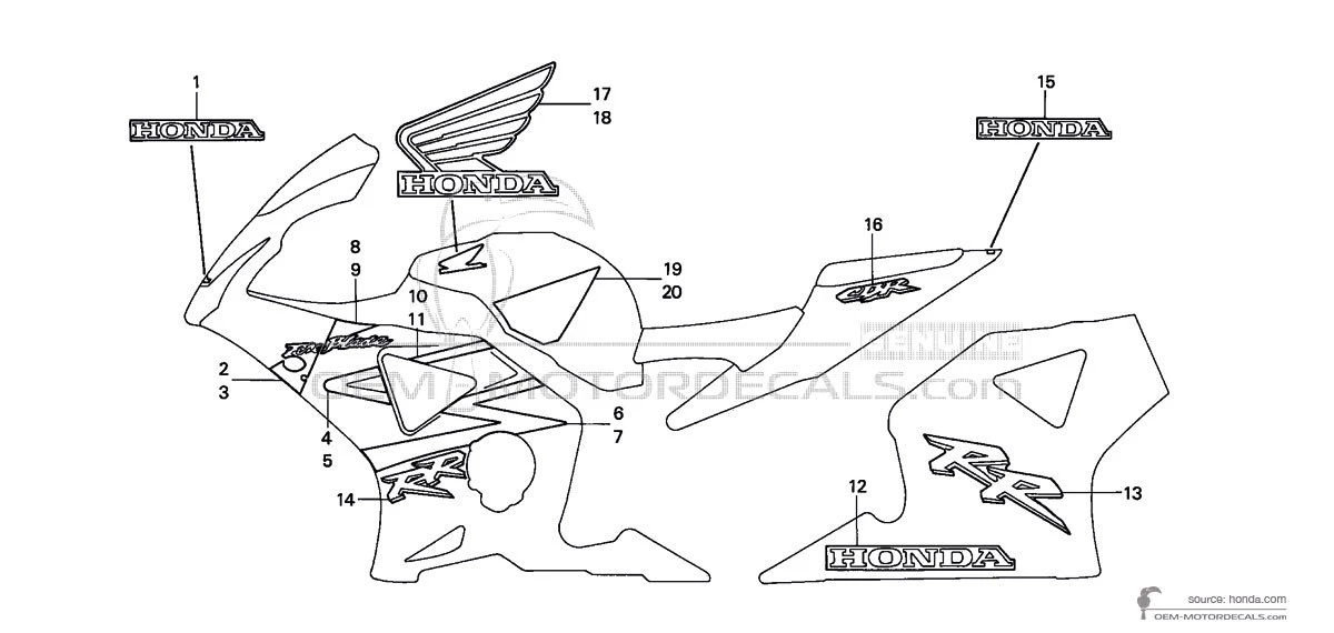 HONDA Adesivo posteriore coda carena - 87556KFR700ZA (87556-KFR-700ZA MARK,RR TR*TYPE1*) Questo è un pezzo di ricambio originale prodotto da Honda. Le decalcomanie originali non solo ripristinano l'aspetto di fabbrica della moto, ma fanno anche risparmiare tempo e, cosa interessante, denaro. Quest..
