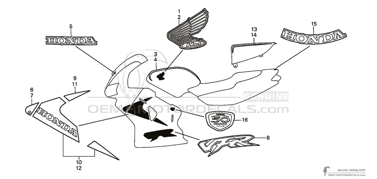 HONDA Zijpaneel embleem - 87107MY9660 (87107-MY9-660 EMBLEM 50TH) Dit is een origineel reserveonderdeel gemaakt door Honda. Originele stickers herstellen niet alleen de fabriekslook van de motorfiets, maar besparen ook je tijd en, interessant genoeg, je geld. Dit is wat OEM-emblemen onderscheidt: ..